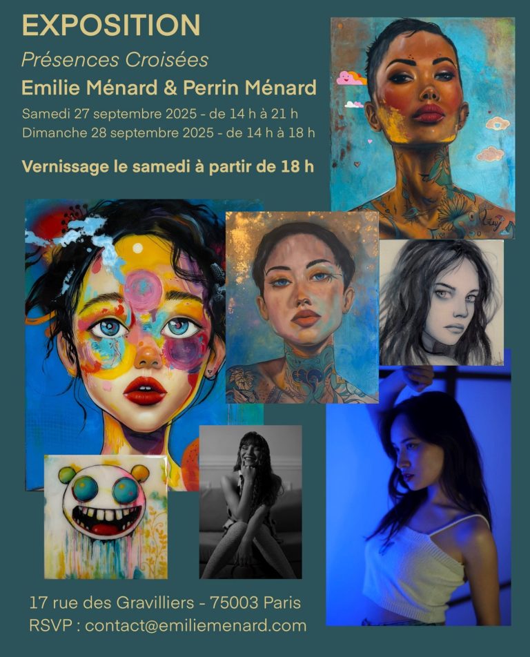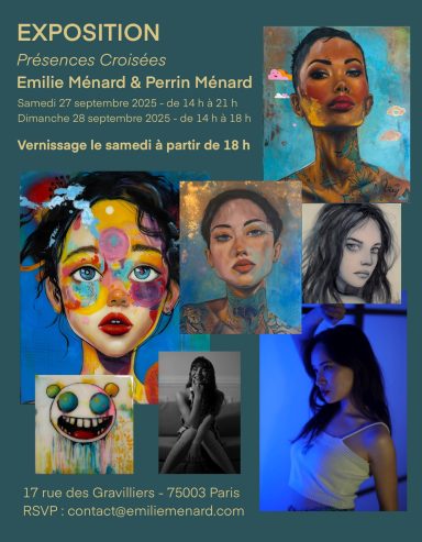 À la galerie Kiff & Marais, Émilie Ménard présentait trois nouvelles séries : Portraits en strates, Abstraits vibratoires et Hyperlucid. Ces œuvres explorent les notions de perception, de conscience et de réalités multiples, inspirées notamment par la physique quantique. L’exposition, marquant un tournant dans sa démarche artistique, mêlait également un travail photographique réalisé avec son frère Perrin Ménard.